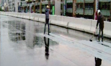SBS沥青防水涂料施工方法:1、基层应干燥、平整、清洁,无灰尘、杂物、油污和青苔。如有洞、孔、裂缝,应用水泥砂浆填实,突出部分凿除。2、逆风涂抹基础处理剂。3、在基层和卷材表面涂胶粘剂,并预留搭接边涂接缝胶。4、铺贴卷材,并排气、压实。5、粘贴搭接缝。